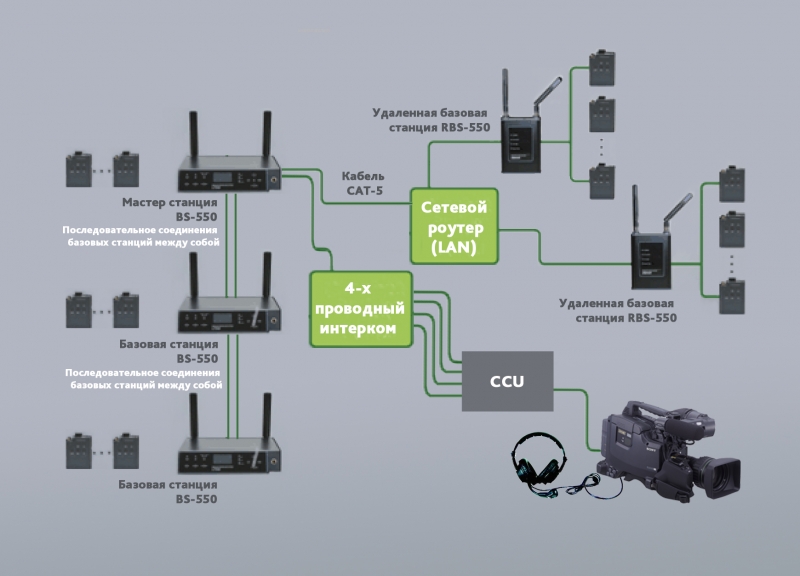 • К каждой базовой станции можно подсоединить до 32 поясных абонентских блоков, а в частности у модели BS-550 может быть до 11 полнодуплексных аудио-выходов. Соединяя две или более базовых системы, можно увеличить количество абонентских поясных блоков и аудио-выходов.