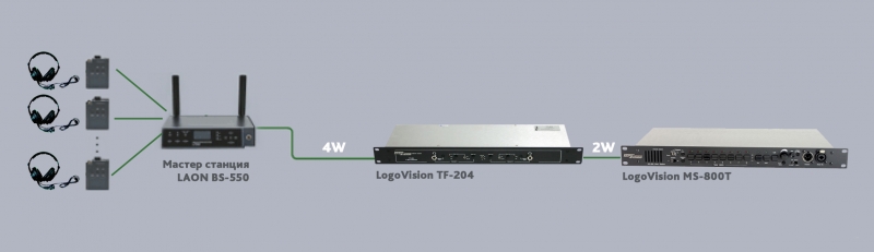 Для тех, кто использует в работе двухпроводные интерком системы и хотел бы расширить их функциональные возможности, может осуществить задуманное за счёт подключения беспроводной базовой станции LAON BS-550. Подключив базовую станцию LAON BS-550 к двухпроводной базовой станции, можно получить дополнительно до 32 полнодуплексных беспроводных абонентов. Система LAON за счёт цифровой высококачественной передачи несжатого аудиосигнала обеспечивает стабильную связь между всеми абонентами, а интерфейсное устройство Logovision - качественное преобразование четырехпроводных сигналов в двухпроводные и обратно. Для подключения к существующей двухпроводной системе базовой станции LAON BS-550 необходимо использовать универсальное интерфейсное устройство Logovision TF-204.