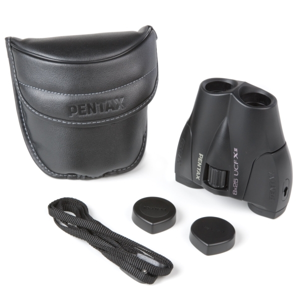 Конструктивные особенности бинокля Pentax 8x25 UCF X IIКомпактный и легковесный бинокль Pentax 8x25 UCF X II можно положить в карман рюкзака или сумки и взять с собой не только в длительное путешествие, но даже на велосипедную или непродолжительную пешую прогулку. Цельнолитой корпус из ударопрочного пластика имеет нескользящее резиновое покрытие, которое надёжно защищает прибор от царапин и пыли, обеспечивая при этом удобный хват. Выдвижные наглазники уменьшают боковую засветку и позволяют установить оптимальное расстояние от глаз наблюдателя до окуляров бинокля. Для длительных стационарных наблюдений предусмотрена установка прибора на штатив (диаметр штативного гнезда ¼ дюйма). В основе оптической конструкции - система призм Porro из качественного оптического стекла Bak-4. При этом полностью отсутствует виньетирование, выходной зрачок получается ровным и круглым. Применение асферических линз сводит к минимуму хроматические аберрации, а полное многослойное просветляющее покрытие всех оптических элементов улучшает светопропускание (что особенное важно для высококонтрастных изображений), повышая яркость и контрастность изображение и чёткость цветопередачи. Очень удобная и простая система настройки и корректировки. Регулировка межзрачкового расстояния по двум осям (в диапазоне 56 – 72 мм) помогает настроить бинокль Pentax 8x25 UCF X II под базу глаз наблюдателя. Центральная внутренняя фокусировка обеспечивает быстрое и точное наведение резкости на объект наблюдения. Диоптрийная коррекция осуществляется с помощью центрального выдвижного регулятора (с возможностью блокировки установленного положения). Условия эксплуатации бинокля Pentax 8x25 UCF X IIРабочая температура в диапазоне от -10°C до +45°C. Технические характеристики бинокля Pentax 8x25 UCF X II