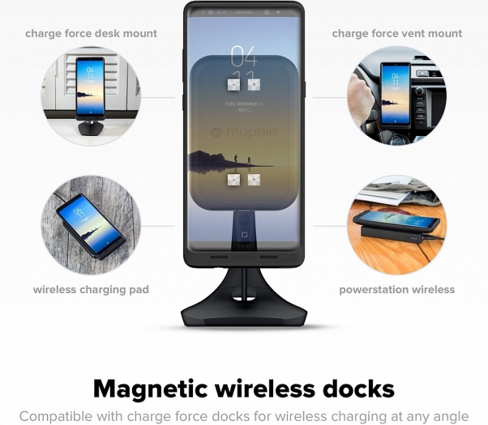 Чехол-аккумулятор Mophie Juice Pack 2950 mAh для Samsung Galaxy Note 8 Mophie Juice Pack 2950 mAh представляет собой стильный и функциональный чехол-аккумулятор для смартфона Samsung Galaxy Note 8. Встроенная в аксессуар батарея имеет высокую емкость и позволяет продлить работу коммуникатора до 33 часов. Такое решение позволит вам отправится в дорогу, не переживая о том, что вы останетесь без связи в местах, где нет доступа к энергосети. Аксессуар имеет тонкий дизайн и практически не увеличивает зрительно телефон. Чехол-аккумулятор Mophie Juice Pack плотно облегает корпус Samsung Galaxy Note 8, повторяя все его линии и изгибы. Имеет немного приподнятый профиль для дополнительной защиты экрана. Аксессуар оставляет в свободном доступе все функциональные разъемы и интерфейсы коммуникатора. К тому же, чехол способен защитить смартфон от механических повреждений и образований на поверхности его корпуса грязи. Mophie Juice Pack имеет встроенный аккумулятор емкостью 2950 мАч и обеспечивает более долгий срок службы штатной батареи Samsung Galaxy Note 8. Чехол имеет LED-индикацию, отображающую уровень заряда встроенной в него батареи. Модель поддерживает практически все виды беспроводных зарядок, а встроенные магниты позволят закреплять телефон в специальных держателях. Зарядка чехла осуществляется одновременно со смартфоном, при этом коммуникатор будет заряжаться первым.