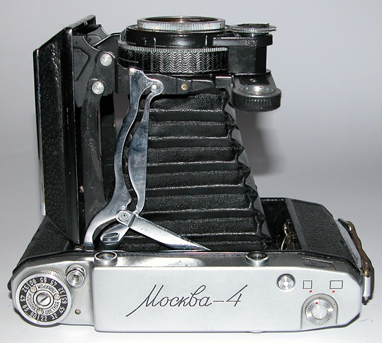 ОписаниеФотоаппарат Москва-4 – представляет собой советский среднеформатный дальномерный фотоаппарат, выпускавшийся с 1955 по 1958 год Красногорским механическим заводом. Камера имеет складной стальной корпус покрытый дерматином. Объектив камеры выдвигается автоматически после откидывания передней панели с помощью рычажной системы, с корпусом объектив соединяется тканевым мехом. Задняя стенка фотоаппарата открывается на петлях. Автоспуск у данной модели отсутствует, зато имеется синхроконтакт, выдержка – любая. Камера рассчитана на работу с пленкой типа 120 с размером кадра 6×9 или 6×6 см, всего получается 8 кадров. Для работы с размером кадра или 6×6 см в фильмовый канал вставляется специальная рамка, входящая в комплект аппарата. Присутствует также блокировка от двойного экспонирования кадра. Характеристики