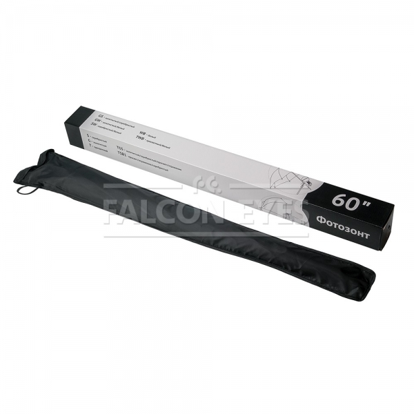 Фотозонт Falcon Eyes URK-60TSB1 Falcon Eyes URK-60TSB1 – комбинированный зонт 2 в 1: просветный/серебристый. Диаметр 122 см. Просветный зонт покрыт белой полупрозрачной тканью. Световой поток от вспышки попадает на ткань зонта, максимально рассеивается и, увеличивая площадь излучения, равномерно освещает объект съемки. Таким образом, резкий точечный свет, излучаемый при срабатывании фотовспышки, преобразуется в достаточно мягкий световой поток, излучаемый с большей площади. Серебристая поверхность зонта дает более жесткий, по сравнению с белыми зонтами, свет, что позволяет получать контрастное изображение с четкими тенями. Два зонта можно использовать совместно для получения более яркого света чем при использовании просвечивающей поверхности, но более мягкого, чем при использовании серебристой. Прочные эластичные спицы из стекловолокна и соединительные элементы из ударопрочного пластика для долговечного использования - спицы не ржавеют, сохраняют форму на протяжении всего срока эксплуатации, устойчивы к механическим воздействиям. Ткань из полиэстера обладает высокой износостойкостью.