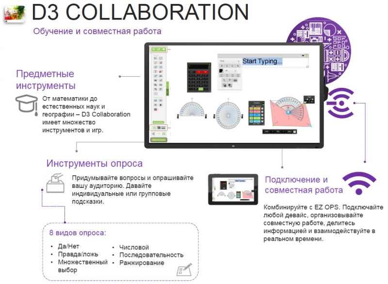 Производительность. Если вы ищете экономичные интерактивные решения, то серия S — прекрасный выбор. Она создавалась специально с учетом требований отрасли образования: в комплект входит специальный пакет программного обеспечения для образования D3 Collaboration. Панели серии S поддерживают полный спектр устройств линейки EZ Accessories, делая занятия более увлекательными, гибкими и интересными.