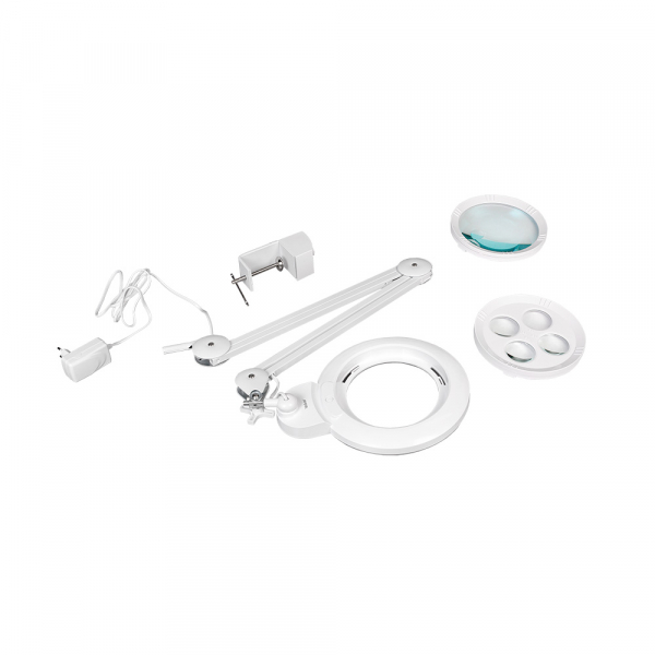 Лупа-лампа Veber 8608D LED Bi-color со сменными линзами Лупа-лампа Veber 8608D LED Bi-color со сменными линзами на струбцине с регулировкой яркости и цветовой температуры, позволяет удобно работать с микро и мини электронными компонентами или печатными платами с плотным монтажом. Для использования лампы-лупы косметологами, важную роль играют возможность получения бестеневого освещения и возможность настройки цветовой температуры, так как цветовая температура — один из самых важных параметров осветителя. Она имеет влияние не только на восприятие света человеческим глазом, но и на цветопередачу окружающих предметов. Лампа найдёт применение в ювелирных мастерских, в химических лабораториях, полиграфии, филателии, ювелирном деле, а также при работе с документами. Кроме того, поможет в бытовых целях — для чтения, рисования, шитья, вышивания, моделирования — везде, где требуется хорошее освещение поля зрения и возможность выбора необходимого увеличения. Источник света В качестве источника света в лампе используется кольцевая светодиодная панель со 120 SMD яркими светодиодами суммарной мощностью 12 Вт. Светодиоды закрыты матовым «молочным» светорассеивателем. Управление яркостью и цветовой температурой осуществляется одной кнопкой, находящейся на корпусе лампы-лупы. Однократное короткое нажатие — включение подсветки, последующие короткие нажатия — циклическое переключение цветовой температуры (3000К «тёплый свет», 4500К «белый свет» и 6000К «холодный свет»). Длительное нажатие кнопки при выбранной цветовой температуре циклически плавно меняет яркость свечения светодиодов (от 30% до 100% яркости). Питание осветителя осуществляется от блока питания, включается в бытовую сеть переменного тока. Сменные линзы Конструкция лупы-лампы Veber 8608D LED Bi-color предусматривает возможность смены кратности увеличения изображения за счёт использования сменных обойм с линзами. Всего в комплекте две таких обоймы: обойма с большой 3-х кратной (Ø 144 мм) и наклеенной сверху на неё 20-кратной линзой (Ø 23 мм) и обойма с четырьмя линзами (Ø 47 мм каждая) кратностью 8х, 10х, 12х и 15х. Оперативно сменить обойму с линзами не составляет труда — её крепление в кольце имеет байонетный тип. Все линзы лупы-лампы изготовлены из оптического стекла. Благодаря этому, создаваемое изображение абсолютно лишено окраски и искажения по краям поля зрения. Материал обойм — прочный противоударный ABS пластик. Кронштейн и крепление Отличительной особенностью конструкции лупы-лампы Veber 8608D LED Bi-color является использование пантографа с поворотно-наклонным узлом крепления осветителя с линзами. Наиболее часто осветитель с линзами ориентируют параллельно плоскости стола, при этом пантограф позволяет изменять высоту осветителя точно сохраняя эту параллельность. Наличие поворотно-наклонного узла крепления позволяет настроить и зафиксировать положение лупы в любой удобной для наблюдателя плоскости. Это удобно, например, при работе с протяжёнными объектами установленными на столе — реставрации керамических изделий, картин и т. д. При этом, пантограф позволяет сохранять параллельность осветителя с линзами при «сканировании» поверхности этих объектов. Пантограф изготовлен из стального квадратного профиля с полимерным защитным покрытием. Внутри профиля скрыты пружины механизма удержания осветителя на выб