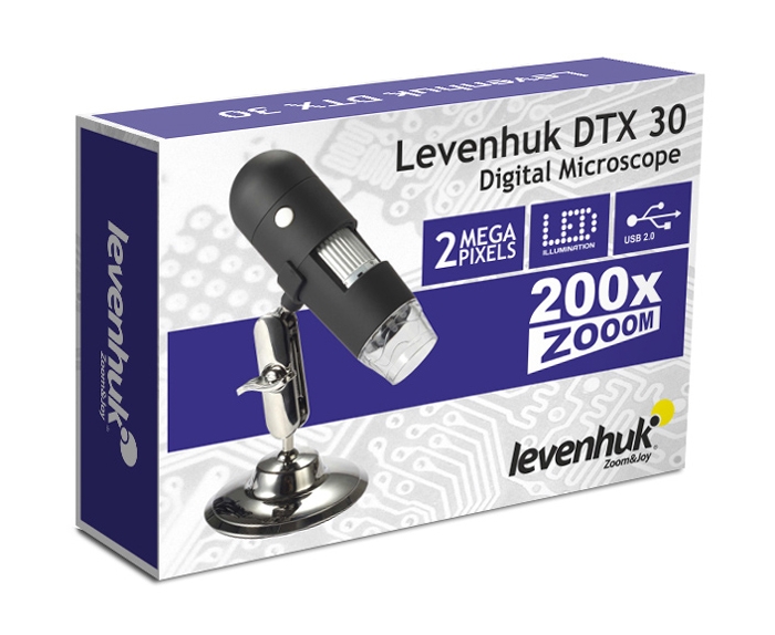Микроскоп Levenhuk DTX 30 – это современный USB-микроскоп с возможностью фото- и видеосъемки изучаемых образцов, оснащенный 2-мегапиксельной камерой и имеющий переменное увеличение в диапазоне от 20 до 230 крат. Модель может использоваться в самых разных областях: в радиоэлектронике, ювелирном деле, биологии, зоологии и др. Микроскоп подключается к компьютеру или ноутбуку через стандартный порт USB 2.0. Изучение образцов и обработка изображения происходит с помощью удобной программы захвата изображения, входящей в комплект поставки. Она имеет интуитивно понятный интерфейс: на панели управления расположены кнопки для редактирования изображения и видео, вывода картинки на печать, сохранения результатов на жесткий диск и другие. В программе реализована функция измерения изучаемого образца, для работы с которой достаточно указать размеры захваченного участка. Программа умеет измерять длину объекта, периметр, радиус/диаметр, а также разнообразные углы. Микроскоп Levenhuk DTX 30 очень прост в использовании и не требует специальной подготовки пользователя. Небольшие размеры прибора делают его очень удобным для домашнего использования. Для наиболее эффективной работы с микроскопом рекомендуется установка на штатив (в комплекте). Корпус микроскопа имеет прорезиненное покрытие, которое не только приятно на ощупь, но и не даст прибору выскользнуть из рук. Особенности: