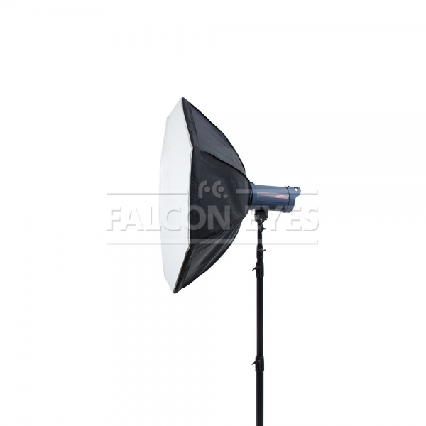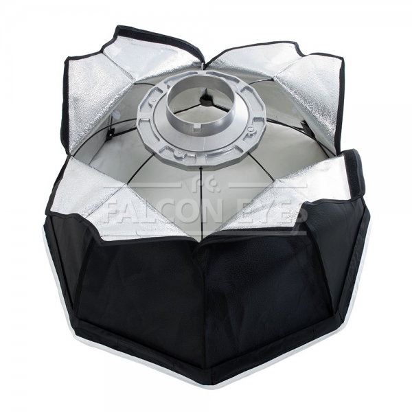 Октобокс Falcon Eyes FEA-OB9 BW — световой модификатор для осветительных приборов с байонетом Bowens (байонетное кольцо сменное, диаметр 145 мм), предназначен для создания мягкого рассеянного освещения без резких теней и бликов. Диаметр октобокса 90 см. Октобоксы позволяют получить равномерный направленный поток мягкого света, при использовании в портретной фотографии дают округлый блик в глазах, имитирующий естественное освещение. Устройство включает в себя отражатель, внешний и внутренний рассеиватель, хвостовик с байонетным креплением. Закрытая конструкция позволяет избежать нежелательных бликов и потерь светового потока. Отражатель, с серебристой тканью внутри, обеспечивает равномерную засветку рассеивателя, который в свою очередь, благодаря большой поверхности, смягчает формируемые тени. Дополнительный внутренний диффузор улучшает равномерность светового потока. Наконечники на упругих металлических спицах не повреждают тканевые спицедержатели софтбокса и облегчают сборку конструкции. Установленный на приборе октобокс можно поворачивать на 360 градусов, выбранное положение фиксируется винтом на адаптере. В комплекте чехол для хранения.