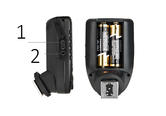 Большой ЖК дисплей, 5 кнопок групп и 4 функциональных кнопки обеспечивают удобство манипуляций. Кнопки групп (1), Функциональные кнопки (2) Обновление прошивки через USB разъем типа С. Беспроводная синхронизация через гнездо для синхрокабеля 2,5мм. USB разъем тип C (1), Гнездо для синхрокабеля 2,5мм (2) *2 батарейки АА Большая портативность Xpro-S – его вес всего 80 г.