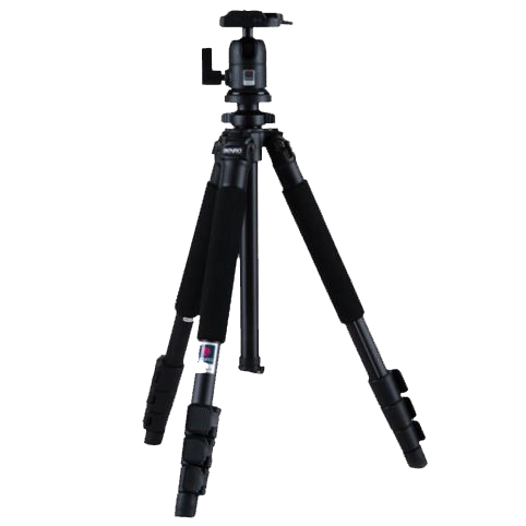 Четырехсекционный облегченный штатив из высокопрочного алюминиевого сплава с быстрой фиксацией секций курковыми эксцентриками. Возможна независимая фиксация опор под углом 24, 55 или 80 градусов от вертикали. Штатив оснащен пузырьковым уровнем, подпружиненным крюком для противовеса, мягкой муфтой для переноски и несъемными резиновыми наконечниками опор. Имеется чехол для хранения штатива. В комплект входит головка BH-1, обеспечивающая высокую надежность крепления, возможность быстрой установки и снятия камеры, а также комфортного управления положением камеры.