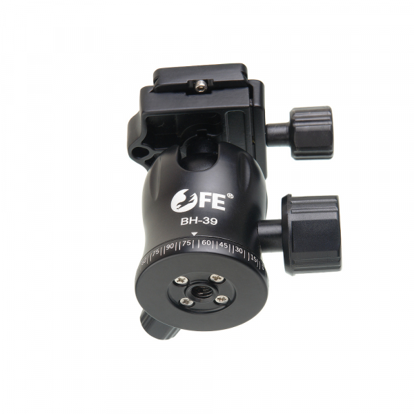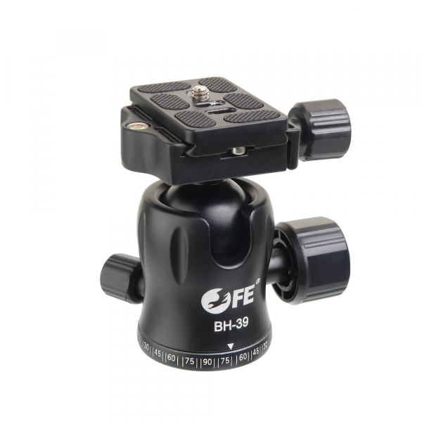Штативная голова Falcon Eyes BH-39 Falcon Eyes ВН-39 — шаровая головка для установки камер на штативы и другие опоры с посадочным винтом 3/8”. Конструкция из алюминиево-магниевого сплава дает возможность быстро выбрать и надежно зафиксировать нужное для съемки положение камеры весом до 15 кг. Для крепления камеры служит быстросъемная площадка размером 60х38,5 мм с конгрессным винтом ¼” и резиновыми накладками. Площадка устанавливается в базу с пазами и фиксируется винтом. От случайного выпадения она застрахована 2 упорами. Для выравнивания положения камеры база оснащена пузырьковым уровнем. Свободное, без рывков движение шара позволяет плавно перемещать камеру, наклонять ее под углом до 90°. Наклон площадки закрепляется винтом с большой удобной рукояткой. Головка дает возможность горизонтального панорамирования на 360°. На поворотном диске в основании конструкции предусмотрена шкала с шагом 5°. Положение головки относительно шкалы фиксируется винтом. Прочное покрытие, нанесенное на корпус и шар методом глубокого анодирования, обеспечивает высокую износостойкость конструкции.