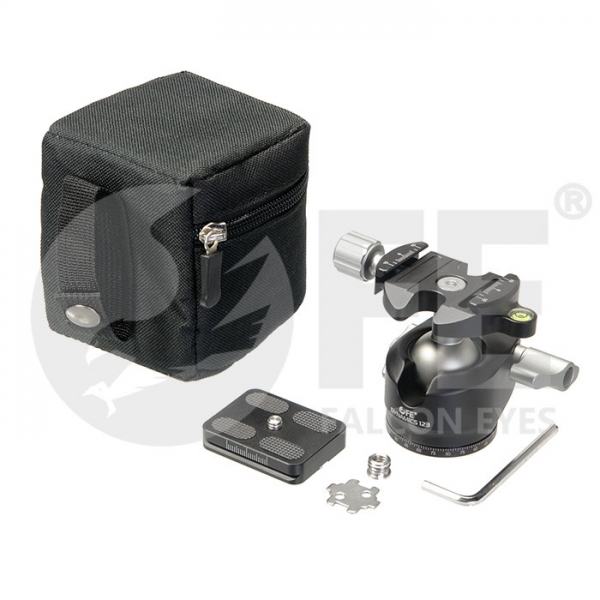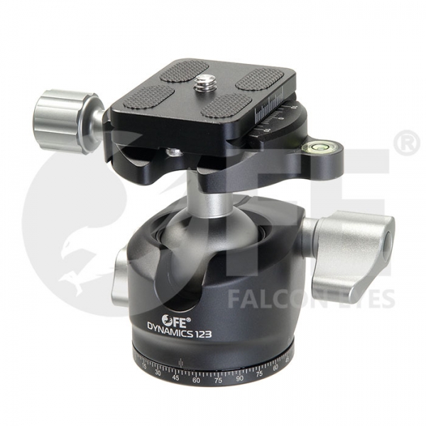Falcon Eyes Dynamics 123 шаровая штативная голова с быстросъемной площадкой, пузырьковым уровнем и поворотным основанием для горизонтального панорамирования, предназначена для установки камер весом до 12 кг, диаметр шара 30 мм, размер площадки 38х50 мм.