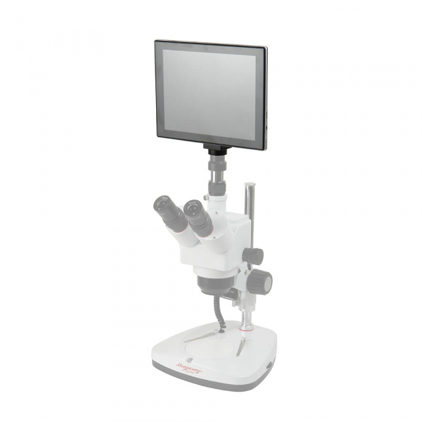Главным образом, система визуализации предназначена для проведения оптического гранулометрического анализа. Система Микромед Visual 5MP 9.7″ может использоваться как с микроскопами плоского поля, так и со стереомикроскопами. Установка системы визуализации возможна в третий (вертикальный) тубус микроскопа или используя специальный переходник (приобретается отдельно) в обычный окуляр любого микроскопа. Более того, установить систему Микромед Visual 5MP 9,7″ можно на телескоп, зрительную трубу или любой другой оптический прибор, оснащённый байонетом C-mount. Поворотный шарнир позволяет изменить угол наклона экрана для комфортной работы наблюдателя.