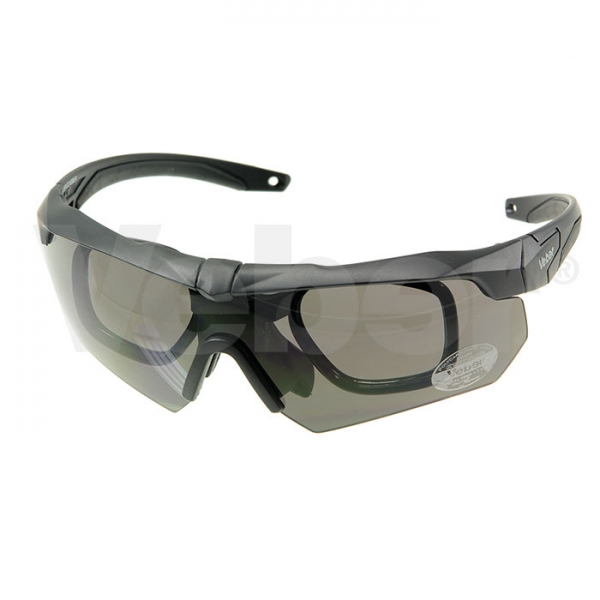 Veber Tactic Force L3P2 - баллистические стрелковые противоосколочные очки с быстросменными ударопрочными поликарбонатными линзами и диоптрической вставкой. Очки предназначены для защиты органов зрения от ультрафиолета, ветра, пыли, а также попадания крупных частиц во время активного отдыха и занятия экстремальными видами спорта, при стрельбе в тире, на охоте или проведении тактических учебных операций. Подходят для повседневного использования. Цвет оправы – черный. Очки комплектуются тремя сменными линзами (бесцветные, темно-серые и желтые), диоптрической вставкой, жестким футляром на молнии, чехлом и фирменным регулируемым шейным ремешком.