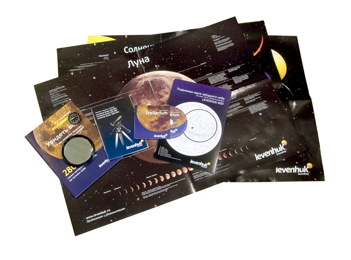 Уникальная сверхширокая дополнительная комплектация телескопов Strike PRO. Такого вы еще не видели! Данная серия телескопов включает в себя не только стандартные аксессуары серий Strike (печатные материалы, набор сменных окуляров, компас, программу-планетарий), но и дополнительные аксессуары, которые помогут использовать телескоп на полную мощность: окуляр Plössl 6,3 мм, 2х-кратую линзу Барлоу, набор цветных фильтров, солнечный и лунный фильтры, а также фирменную сумку для переноски телескопа Levenhuk Zongo 60. Сам телескоп Levenhuk Strike PRO упакован в картонную коробку привлекательной яркой расцветки.
