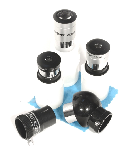 • Поставляется в комплекте с тремя сменными окулярами (5 мм, 10 мм и 25 мм), линзой Барлоу 3х, искателем 5х24