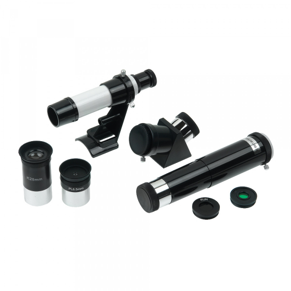 Принадлежности для работы с телескопом не нужно подбирать, всё необходимое есть в комплекте. В первую очередь это окуляры Pl6,5 и К25 с мягкими наглазниками, защищающими от боковой засветки. Если наблюдатель носит очки, то для более комфортной работы он может загнуть наглазник, чтобы уменьшить расстояние между окуляром и зрачком. Обязательно пригодятся и линза Барлоу 3х, повышающая кратность окуляров в 3 раза, и фильтры – солнечный, снижающий интенсивность света до безопасных значений, и лунный, увеличивающий контраст.
