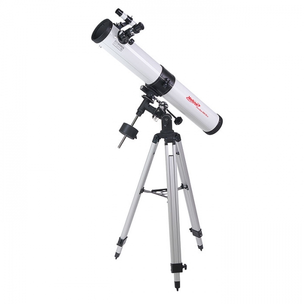 Этот недорогой зеркальный телескоп-рефлектор на экваториальной монтировке хорошо подойдет для первого знакомства с астрономией. Прибор имеет внушительные габариты (длина 860 мм, диаметр зеркала 76 мм). Благодаря большому фокусному расстоянию и богатой комплектации оптическими аксессуарами, вы можете выбрать оптимальное увеличение — от 45х для наблюдений днем (ближняя дистанция фокусировки 20,5 м), до 450х — для ночных небесных исследований. В этот прибор вы сможете рассматривать лунные кратеры диаметром около 6 км, Сатурн, Марс, некоторые из ярчайших туманностей. Вес самой трубы невелик, поэтому монтировка типа EQ2 (с возможностью установки дополнительного часового механизма) является оптимальной. Телескоп поставляется в комплекте с алюминиевым штативом, который имеет дополнительные металлические распорки (для повышения устойчивости), и металлическим столиком для аксессуаров.
