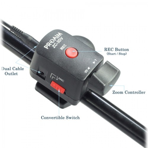 Зум-контролер фирмы для DV камер — универсальный контроллер для LANC и Panasonic Mini DV или HDV камер с преобразователем для LANC (большинства камер Sony и Canon). Чувствительный ползунковый переключатель позволяет регулировать скорость зума от медленной до быстрой. Рычаг изменения фокусного расстояния позволяет уменьшить зум для работы с широкоугольными или телеобъективами. Легкий вес и компактность, а также наличие разъема для кабеля позволяет устанавливать его на ручки вращающиеся ручки штатива, монопод (или одиночную опору), стабилизаторы и прочие устройства.