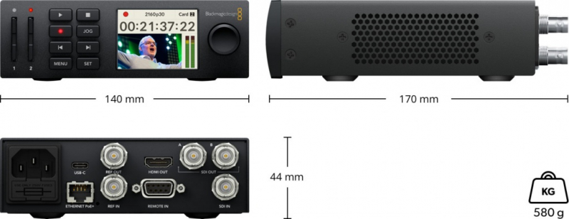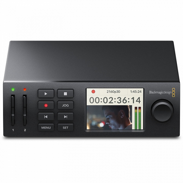 HyperDeck Studio Mini имеет традиционные для видеомагнитофона органы управления, в том числе кнопку перемотки и ручку прокрутки. Встроенный ЖК-дисплей высокого разрешения выводит информацию о тайм-коде и позволяет в полном цвете просматривать текущий клип в режиме записи или воспроизведения. Кроме того, он показывает состояние записи для каждой карты, формат видео, кадровую частоту и уровень звукового сигнала. Такой функционал делает работу не только быстрой, но и удобной!