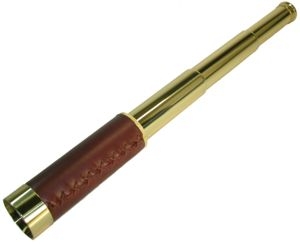 Конструктивные особенности сувенирной телескопической трубы 25х30 PIRATEСкладная телескопическая подзорная труба 25х30 PIRATE представляет собой подзорную трубу Галилея, окуляром в которой служит рассеивающая линза. Такая оптическая схема даёт неперевёрнутое (земное) изображение. К сожалению, оптика такого типа имеет очень малое поле зрения и характеризуется наличием хроматических аберраций. Для того, чтобы изображение было максимально ярким и контрастным, на поверхности линз наносится многослойное просветляющее покрытие (для улучшения светопропускной способности системы и уменьшения потерей света на отражение). Данная модель телескопической трубы изготовлена в латунном корпусе, покрытие из искусственной кожи (цвет – коричневый) не только обеспечивает респектабельный внешний вид, но и позволяет удобно удерживать прибор в руках. Конструкция очень проста в использовании и настройке. Необходимо максимально раздвинуть 4-х коленный корпус и навести резкость на предмет наблюдения (минимальная дистанция фокусировки 15 м) путём вращения последней, расположенной ближе к глазу, секции корпуса. Сувенирная подзорная труба не имеет крепления для установки на штатив, при этом в разложенном виде оптический прибор имеет длину 324 мм. Поэтому наблюдения рекомендуется вести с установкой на опору (холм, дерево, перила или борт судна), ведь это позволит стабилизировать изображение и уменьшит нагрузку на руки при длительных изучениях объектов. Комплектация сувенирной телескопической трубы 25х30 PIRATEВ комплект поставки входит футляр с петлёй для ношения на поясе / на запястье Технические характеристики сувенирной телескопической трубы 25х30 PIRATE
